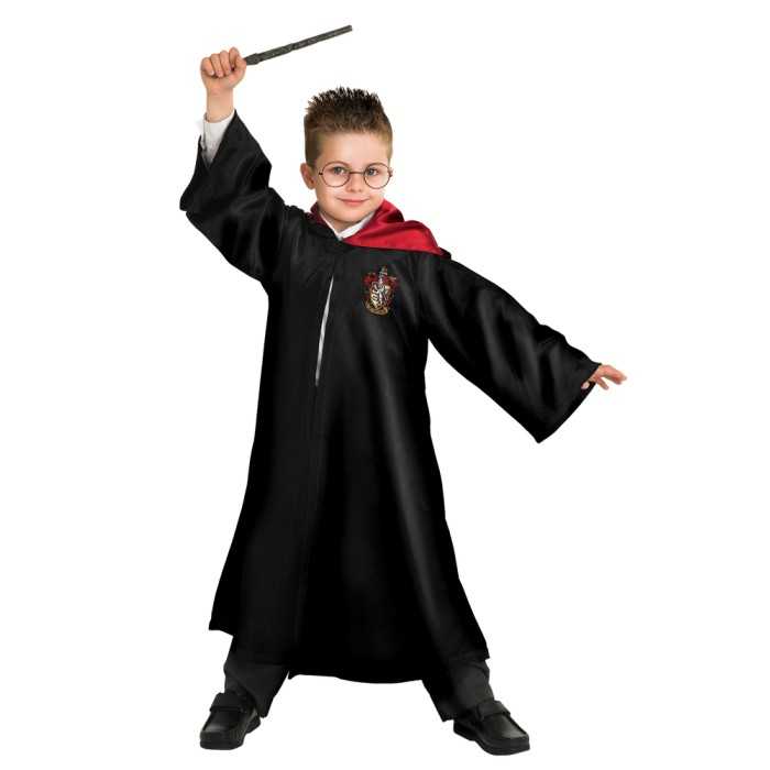Une robe effet velours noir doublée d’une matière satinée rouge au niveau des revers et de la capuche intégrée. Le blason de la maison Gryffondor est brodé sur la robe.