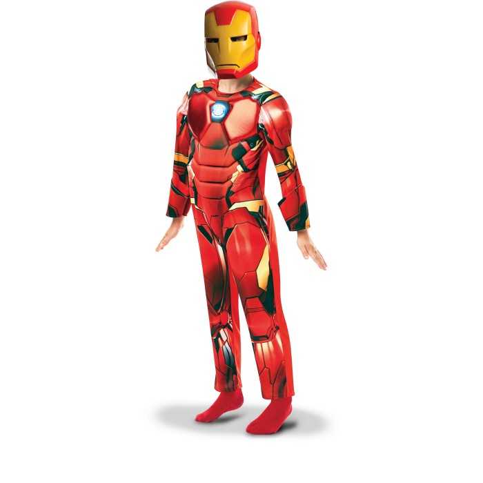 Une combinaison rouge et or à manches longues en jersey imprimé effet « armure » avec attache velcro dans le dos et torse rembourré. Un masque en PVC assorti à l’effigie d’Iron Man avec attache velcro à l’arrière et ouvertures pour les yeux.