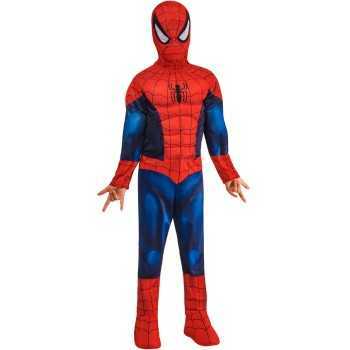 Une combinaison à manches longues en tissu jersey imprimé rouge et bleu. Muscles rembourrés au niveau du top et des manches. Logo araignée sur le torse. Couvre-bottes intégrés. Une cagoule imprimée assortie avec attache velcro à l’arrière.