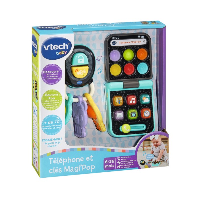 Coffret Clés + Téléphone Magi'Pop - 6 - 36 mois Un coffret composé de clés et d’un téléphone pour faire le plein d’apprentissages en exerçant sa motricité. Ce coffret clés + téléphone encourage la motricité fine de Bébé. Les différents éléments qui le composent sont à la fois durs et souples pour stimuler le toucher des tout-petits. Sur les clés, Bébé s’amuse à cliquer sur les 2 boutons non électroniques pour déclencher des sons amusants. 3 hochets dont 1 hochet de dentition en forme d’ours sont également inclus et permettent à Bébé de faire ses dents et de manipuler les boutons en plastique souple. Lorsque le téléphone est ouvert, 6 touches colorées et lumineuses permettent d’accéder à différentes applications : Podcast, musique, messagerie, météo, appareil photo ou encore Horloge. Les tout-petits s’amusent aussi à manipuler les 6 touches « pop-up » en plastique souple. Lorsque le téléphone est plié, Bébé découvre les animaux grâce aux 6 touches « pop-up » lumineuses en plastique souple. 1 curseur Appel est également à faire glisser. 2 chansons et 10 mélodies. Arrêt automatique et réglage du volume sonore. Boîte ouverte. Fonctionne avec 1 pile LR03 fournie.