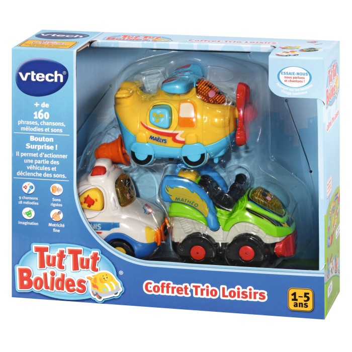 Tut Tut Bolides - Coffret trio loisirs - 1 - 5 ans Un pack de 3 véhicules à thème à collectionner : Maëlys l'avion à hélice, Yanis Capitaine police et Mathé quad super turbo. Les Tut Tut Bolides accompagnent Bébé dans ses premières découvertes : nom, fonctions et particularités de chacun des véhicules, développement de la motricité… Un bouton lumineux en forme de visage rigolo déclenche 3 chansons, 6 mélodies, des phrases et des effets sonores réalistes. Magique ! En appuyant sur le bouton surprise, un élément du véhicule s'active (hélice de l'avion, le mégaphone de la voiture de police et les turbos du quad). Tous les véhicules sont compatibles avec les Zones Magiques des univers Tut Tut Animo et Tut Tut Bolides. 3 chansons, 6 mélodies et plein de sons amusants. Arrêt automatique. Boite try-me. 6 piles LR03 fournies (2 par véhicule).