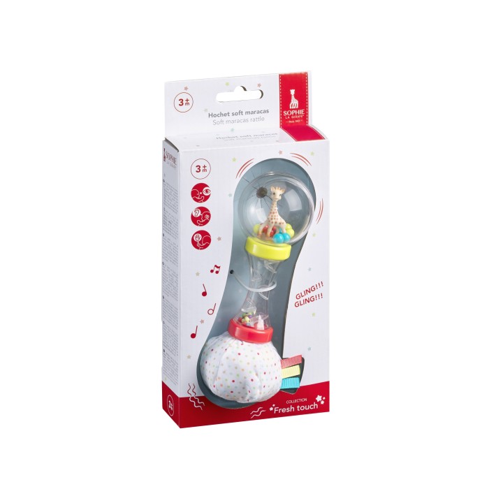 Un incontournable pour amuser bébé ! Un incontournable pour amuser bébé ! Grâce à la forme ergonomique de sa poignée, il est facile à saisir et à manipuler. Rigolo, bébé l’agite pour voir et entendre les billes multicolores s’entrechoquer. À découvrir : un bâton de pluie et des billes de couleurs qui se mélangent autour de Sophie la girafe. Malin, la boule tout en textile éveille bébé grâce au son de papier froissé et aux étiquettes texturées qui la compose. À manipuler sans modération avec les doigts et/ou la bouche