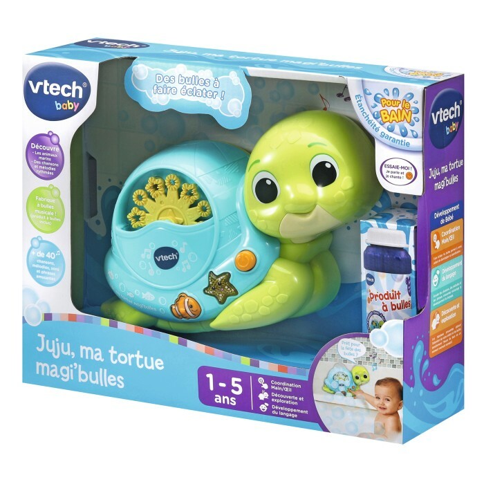 Juju, ma tortue magi bulles - 1 - 5 ans Une jolie tortue de bain qui projette des bulles ! Magique ! Juju fabrique des bulles qui volent dans le bain de Bébé tout en déclenchant de la musique ! Ses 2 boutons interactifs (un bouton poisson clown et un bouton étoile de mer) permettent de déclencher des phrases, des chansons, des mélodies et des sons amusants. Grâce à ses deux ventouses, Juju la tortue se fixe facilement aux parois d’une baignoire. Produit à bulles inclus. 4 chansons et 12 mélodies. Arrêt automatique. Boîte Try-me. Fonctionne avec 3 piles LR6 fournies.
