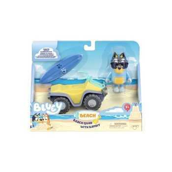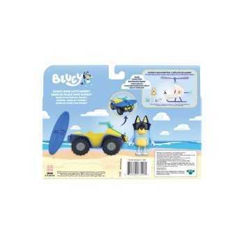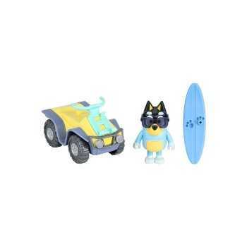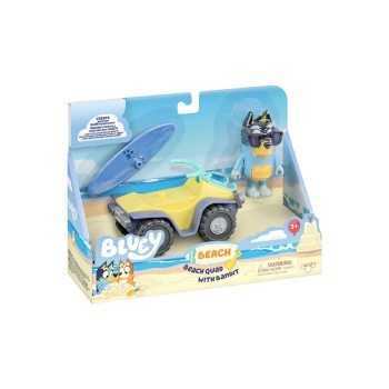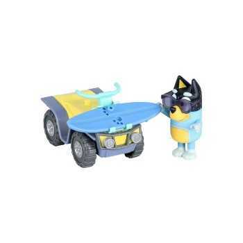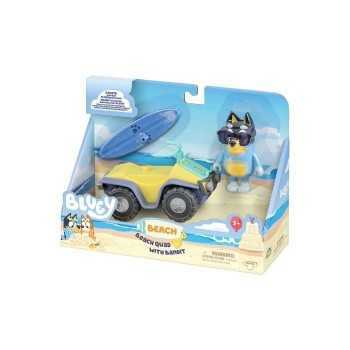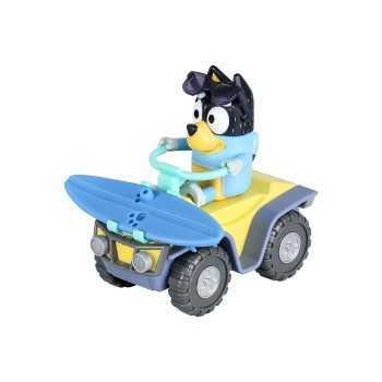 Découvre le quad de plage de Bluey. Il inclut une figurine de Bandit, le papa de Bluey, une paire de lunette de soleil et une planche de surf.