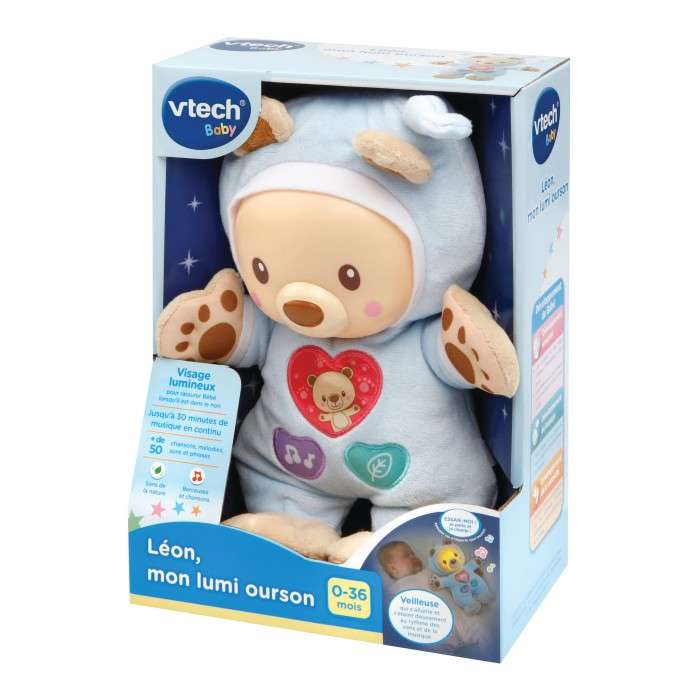 Léon, mon lumi ourson - 0 - 36 mois Le visage lumineux de Léon rassure Bébé au moment du coucher et l'intensité lumineuse varie au rythme des mélodies ce qui apaise Bébé. Un gros bouton en forme de cœur sur son ventre pour déclencher des phrases apaisantes et des mélodies douces. Un bouton Musique pour déclencher de jolies berceuses et un bouton Sons de la nature. Minuterie réglable pour écouter 15 ou 30 minutes de musique en continu avec ou sans lumière. 40 berceuses et 2 chansons. Ourson lavable en surface (module électronique détachable). Réglage du volume sonore et de l'intensité lumineuse. Arrêt automatique. Boîte Try-me. Fonctionne avec 2 piles AA-LR6 fournies.