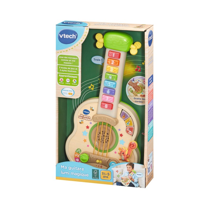 Ma guitare lumi magique (jouet avec partie bois FSC®) - 1.5 - 5 ans Une guitare lumineuse et interactive pour faire ses premiers pas en tant que musicien ! • Grâce à cette jolie guitare en partie en bois certifié FSC®, les tout-petits découvrent la musique tout en s’amusant. • 8 touches lumineuses permettent de découvrir les couleurs, les chiffres et des mélodies en fonction du mode choisi. • Comme sur une vraie guitare, les cordes sont interactives pour jouer et créer ses propres compositions musicales. • Magique ! L’enfant peut choisir un style de musique grâce aux 3 boutons lumineux : guitare classique, guitare électrique ou sons d’animaux. • Un bouton Musique permet de déclencher des chansons. • Trop rigolo ! En manipulant l’écureuil, Bébé déclenche des phrases amusantes et des effets sur les mélodies • Avec cheville de réglage mécanique pour stimuler la motricité fine des tout-petits. • 4 chansons et 75 mélodies. Arrêt automatique et réglage du volume sonore. Boite Try-me. Fonctionne avec 3 piles LR6 fournies.