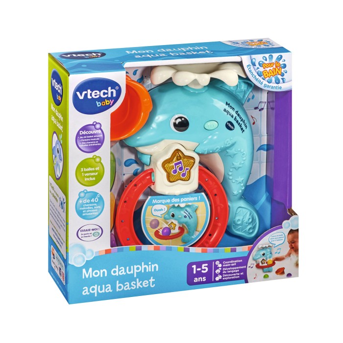 Mon dauphin aqua-basket - 1 - 5 ans Un dauphin trop rigolo pour jouer au basket et faire le plein de découvertes dans le bain ! - 2 ventouses au dos du jouet permettent de fixer le dauphin sur les parois d’une baignoire. - 1 bouton Musique lumineux déclenche des chansons, des mélodies, des sons et des phrases amusantes. - 1 panier de basket : en appuyant dessus, les tout-petits déclenchent des sons et des phrases rigolotes. - 3 balles colorées sont incluses pour pouvoir jouer avec le panier et devenir un vrai pro ! En versant de l’eau sur le dauphin grâce au verseur inclus, l’eau sort du panier par des jets amusants ! Pour un rangement plus facile, le panier de basket se replie. 3 chansons et 12 mélodies. Arrêt automatique. Boîte Try-me. Fonctionne avec 1 pile LR03 fournie.