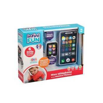 Les tout-petits ont aussi leur montre fitness et téléphone ! La montre propose 6 défis sportifs amusants (danser, sauter, etc.) et permet d’imiter des appels, écouter de la musique et organiser des rendez-vous. Le téléphone, avec 4 modes de jeu, enseigne chiffres, couleurs et sons d’animaux, rappelant après quelques secondes pour encore plus de fun. Parfait pour stimuler l’imagination !