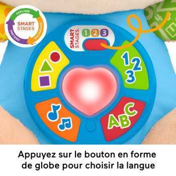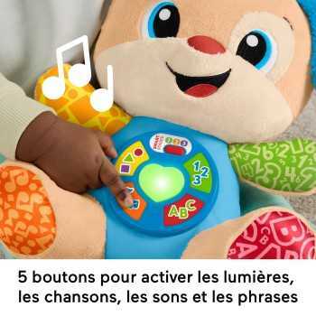 Puppy est une peluche interactive aux différentes textures à découvrir avec la technologie Éveil Progressif et 50 chansons. 6 boutons sur pieds, mains et oreille et le ventre.