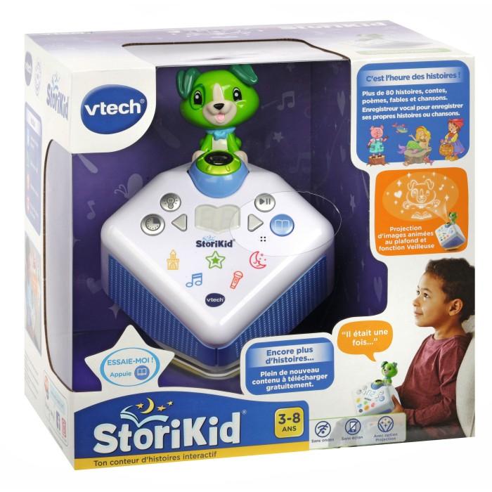 StoriKid - Mon conteur d’histoires (vert) - 3 - 8 ans Un conteur d’histoires avec projection lumineuse pour s’endormir en histoire ou en chanson. Les différentes voix des personnages et narrateur, les sons réalistes et les mélodies donnent vie aux histoires. Plus de 80 contenus inclus : 19 contes (Les trois petits cochon, Cendrillon, La Belle et la Bête, La petite sirène...), 16 poésies classiques (poèmes français d’auteurs classiques), 14 fables (La Fontaine et fables d’autres pays), 9 histoires pour s’endormir, 23 chansons. Magique ! La projection accompagne les histoires et chansons et le petit chien réagit et s’anime différemment en fonction du conte choisi. Les parents peuvent également enregistrer leur propre histoire ou chanson personnalisée. Jusqu’à 10 minutes d’enregistrement. Un bouton pour activer une jolie veilleuse Packs additionnels à télécharger gratuitement en ligne ! Une minuterie permet de choisir le nombre d'histoire à écouter. Mémoire interne pouvant contenir : 100 histoires de 4 minutes et 35 mélodies de 3 minutes. Boîte try-me. Fonctionne avec 4 piles LR6 fournies ou adaptateur secteur inclus.