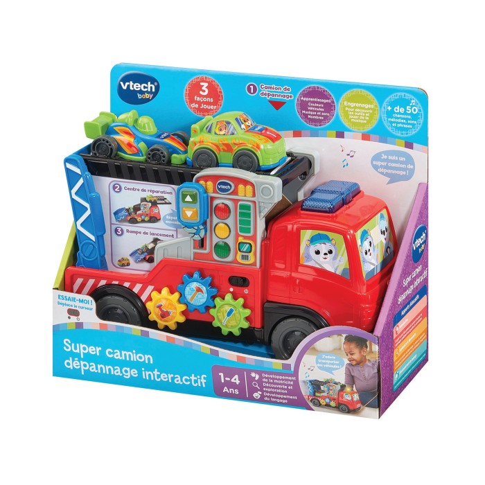 Super camion dépannage interactif - 1 - 4 ans Un camion complet pour réparer, transporter et faire la révision de ses véhicules ! 2 modes de jeu : réparation ou transport de véhicules. 3 boutons interactifs et engrenages à faire tourner pour découvrir les outils et déclencher des mélodies et des chansons. 1 rampe à déployer pour transformer le camion et passer automatiquement d’un mode de jeu à l’autre. 1 bouton interactif sur la plateforme interne du camion pour déclencher des effets sonores réalistes, des mélodies et des phrases amusantes. Le bouton peut être déclenché manuellement ou en plaçant un véhicule dessus. 2 véhicules colorés non électroniques inclus. Un gyrophare lumineux qui s’illumine au rythme des mélodies. Un curseur mécanique à déplacer pour travailler la motricité fine de l’enfant. Une corde pour guider le camion et l’emmener en mission. 4 chansons et 10 mélodies. Arrêt automatique et réglage du volume sonore. Boite Try-me. Fonctionne avec 2 piles LR03 fournies.