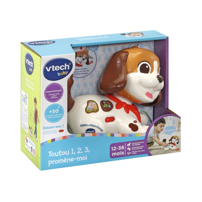 Toutou, 1,2,3 Promène-moi - 12 - 36 mois Un petit chien interactif tout mignon à câliner et à promener partout ! Lorsque Bébé fait rouler le petit chien avec la laisse, il déclenche des phrases et des sons amusants grâce au détecteur de mouvement. Il avance en se dandinant et en bougeant la tête pour inciter l’enfant à le suivre. 2 boutons lumineux permettent aux tout-petits de découvrir les premiers mots en écoutant des chansons, des mélodies et des anecdotes sur les chiots. Trop mignon, lorsque Bébé appuie sur la tête de Toutou, ses oreilles s’animent ! Trop rigolo, la queue de Toutou est pivotante. Bébé peut la faire tourner ! Rangement de la laisse dans le compartiment à piles. + de 50 chansons, mélodies, sons et phrases. Réglage du volume sonore et arrêt automatique. Boîte Try-me. Fonctionne avec 2 piles LR03 fournies.