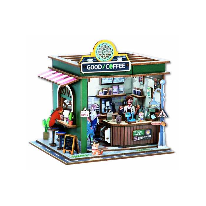 Ce booknook miniature capture l’ambiance cosy d’un coffee shop urbain, avec son petit bar en bois, ses chaises hautes et sa table accueillante, parfait pour savourer un café dans un coin chaleureux glissé entre deux livres.