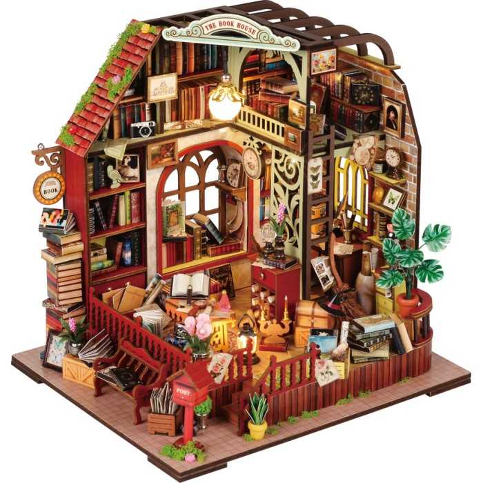 Ce booknook dévoile une bibliothèque sur deux étages au charme d’antan, remplie de livres aux reliures vieillies, de meubles en bois sculpté, de plantes vertes et de lumières tamisées, recréant l’atmosphère feutrée des bibliothèques où on aiment se prélasser.