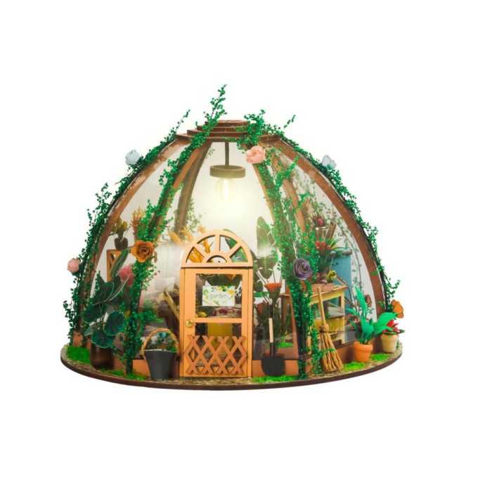 Un mini jardin étoilé avec un design circulaire. Ce jardin est recouvert d'un dôme transparent, décoré de diverses plantes et fleurs à l'intérieur, créant une atmosphère paisible et rêveuse. Il y a un évent hexagonal en haut du dôme. Au centre du jardin, il y a une petite structure de maison avec une arche, entourée de diverses plantes en pot, y compris des roses, des fougères et d'autres plantes vertes. L'ensemble de la scène est conçu pour ressembler à la fois à une serre miniature et à une forêt miniature.