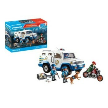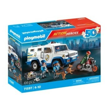 Lancez-vous dans une aventure de chasse aux méchants avec le fantastique Fourgon blindé avec convoyeurs de fonds PLAYMOBIL. Réédité à l'occasion du 50e anniversaire de PLAYMOBIL, c'est une véritable invitation à l'action ! Rejoignez la fête ! PLAYMOBIL célèbre ses 50 ans et il est temps de célébrer ! En 1974, un ouvrier du bâtiment, un chevalier et un indien ont fait leur apparition, captivant les cœurs des enfants du monde entier. Pendant 50 ans, ces personnages souriantes ont inspiré les enfants à créer leurs propres histoires, à jouer différents rôles et à se lancer dans d'innombrables aventures dans le royaume de l'imagination. Pour marquer cette occasion spéciale, nous vous présentons à nouveau le set du Fourgon blindé avec convoyeurs de fonds. Lors du braquage audacieux du grand transporteur de fonds, un voleur cupide tente de s'emparer du butin et de s'échapper sur sa moto rapide. Dans ce scénario astucieux, l'un des compagnons du transporteur peut se transformer en un voleur rusé en pivotant simplement sa tête. Le toit du transporteur est détachable et ses portes arrière s'ouvrent.
