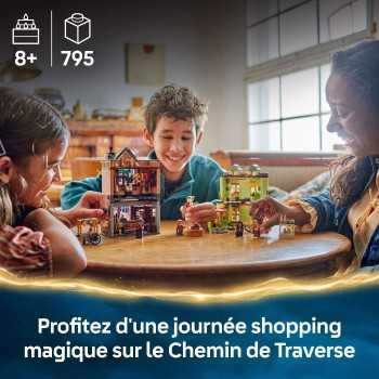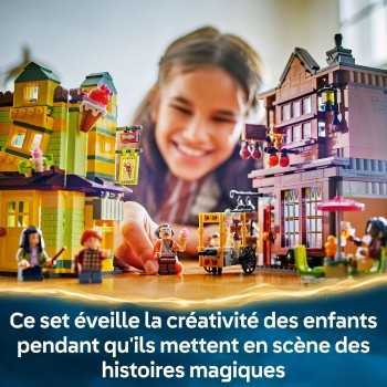 Rendez-vous sur le Chemin de Traverse et visitez le magasin d’accessoires de Quidditch et le glacier Florian Fortarôme pour des aventures magiques avec ce set LEGO Harry Potter pour enfants dès 8 ans (76452). Ce jouet de construction est un superbe cadeau d’anniversaire pour un garçon ou une fille de 8 ans ou plus, passionné(e) par l'univers de Harry Potter. Il inclut les maquettes en briques LEGO détaillées de 2 boutiques mythiques, ainsi que 6 minifigurines. Le magasin de Quidditch est décoré d’un balai volant et regorge d’accessoires inspirant le jeu créatif. Le glacier s’ouvre pour faciliter le jeu et propose des sièges à l’intérieur et en terrasse, ainsi qu’un kiosque à glaces dans la rue. Le magasin d'accessoires de Quidditch et le marchand de glaces peuvent être reliés entre eux et à d’autres modèles du Chemin de Traverse LEGO Harry Potter (vendus séparément), pour créer une jolie rue commerçante en briques. Construisez entre amis ou en famille (de 1 à 3 constructeurs) : avec l’appli LEGO Builder, la construction devient une expérience amusante et collaborative.