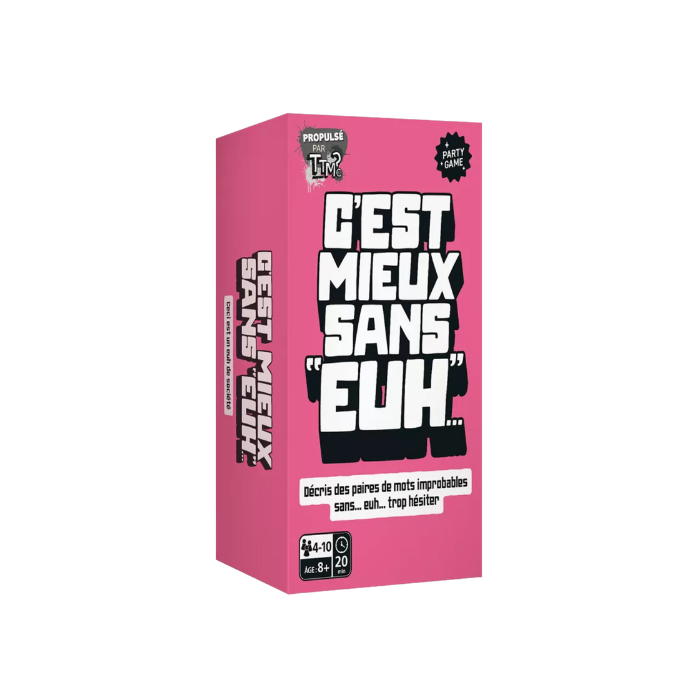 La mission est simple : tu ne peux pas dire « euh » ! En 45 secondes, décris des noms et adjectifs improbables sans prononcer de sons interdits, comme « euh », « hum » ou « ahh ». Pour chaque paire de mots correctement devinée, l’équipe avance d’une case sur le plateau. À chaque fois qu’elle entend un son interdit, l’équipe adverse sonne la cloche et avance d’une case. À la fin du tour, on inverse les rôles et la pression change de camp ! Un jeu superbement adapté en France par les créateurs de TTMC, inspiré de l’immense succès anglais ¨You Can’t say Umm¨. Points forts : Un jeu d’ambiance drôle et accessible pour toute la famille Challenges variés et originaux