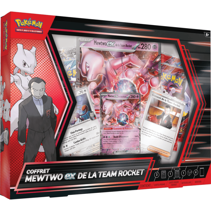Plongez au cœur de l'univers des vilains emblématiques de Pokémon avec le Coffret Mewtwo-ex de la Team Rocket, une édition redoutable pour les collectionneurs et les stratèges du JCC Pokémon ! Ce set collector comprend également deux cartes brillantes à l’effigie de Miaouss et Giovanni, une carte jumbo de Mewtwo-ex idéale pour l’exposition, ainsi que quatre boosters pour renforcer votre deck avec de nouvelles cartes. Pour prolonger l’expérience, un autocollant photo exclusif et une carte à code pour le JCC Pokémon Live sont également inclus.