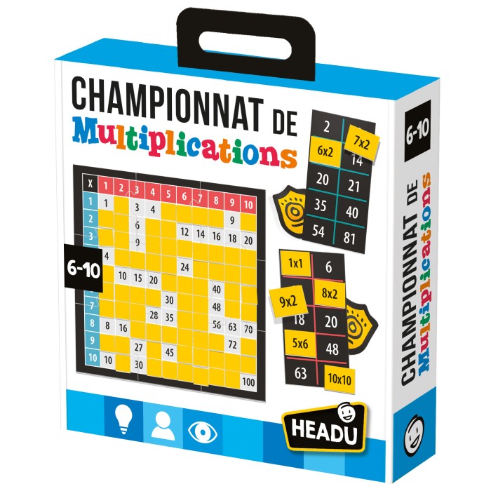 Pêche une carte, lis la multiplication et trouve le résultat correspondant sur le tableau. Mais attention, tu devras parfois être plus rapide que ton adversaire ! Un super championnat de tables de multiplications pour s’entraîner à calculer et découvrir la table de Pyt