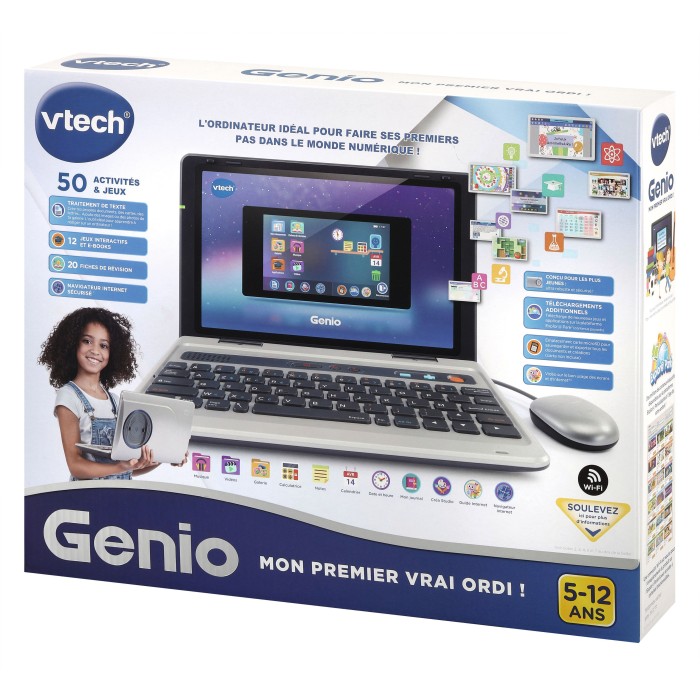 Genio, mon premier vrai ordi ! - 5 - 12 ans Genio est le premier ordinateur de l’enfant, spécialement pensé pour lui. Il reprend les codes des vrais ordinateurs : interface, clavier AZERTY, souris, écran 5’’, mémoire de 8Go extensible via carte micro-SD (non incluse). Plus de 50 activités et applications dont un vrai logiciel de traitement de texte pour faire ses devoirs et s’amuser. 20 fiches de révision incluses sur différents thèmes (mathématiques, français, sciences, histoires, etc.). L’enfant peut enregistrer son fichier en PDF, sur la carte micro-SD. Un ordinateur sécurisé : -> Navigateur internet avec liste blanche : l’enfant n’a accès qu’aux sites approuvés par ses parents -> Vidéo de sensibilisation aux données personnelles, au temps de jeu sur écran et aux dérives d’Internet et des réseaux sociaux -> Contrôles parentaux renforcés : arrêts programmés & limitation du temps de jeu L’enfant développe sa créativité avec les applications de créations artistiques. Des jeux ludo-éducatifs inclus, fonctions horloge, calculatrice, rappels et bien plus encore ! Téléchargement de contenus additionnels via l’Explor@ Park. Arrêt automatique. Boîte fenêtre. Batterie rechargeable intégrée. DAS pour la tête : 0.148 DAS pour le tronc : 0.570 DAS pour les membres : 0.735