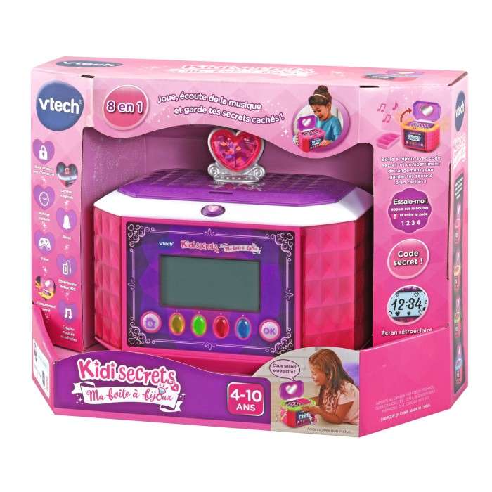 KidiSecrets Ma boîte à bijoux - 4 - 10 ans Une boîte à bijoux vraiment magique, avec écran rétroéclairé, pour garder ses secrets à l’abri et bien plus encore ! 8 en 1 : - Boîte à bijoux avec ouverture par code secret - Lumières magiques - Horloge parlante - Réveil - 9 jeux - Enceinte pour lecteur MP3 - Compartiment secret - Création musicale et mélodies A l'intérieur, un miroir et des compartiments et espaces de rangement pour ranger ses bijoux et garder tous ses secrets. Fonctionne avec 4 piles AA-LR6 Boîte Try-me