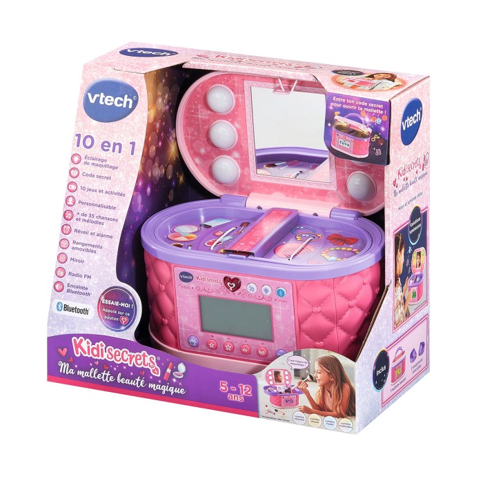 KidiSecrets – Ma mallette beauté magique - 5 - 12 ans Une mallette pour cacher ses secrets beauté avec un miroir lumineux ! Magique ! La mallette s’ouvre grâce au code secret chiffré et s’illumine grâce aux 6 LED comme un véritable miroir pour se maquiller ! Un écran LCD pour afficher l’heure, son code secret et pour afficher des animations et des jeux. 3 espaces de rangement : un grand rangement dans le fond de la mallette et 2 petits plateaux pour ranger ses bijoux. 10 jeux inclus + 1 mode Playlist pour écouter des chansons et mélodies entraînantes, faire de l’exercice ou se relaxer. Connexion Bluetooth pour transformer sa mallette en enceinte et écouter sa musique depuis un téléphone ou lecteur MP3. Fonction radio incluse. 4 boutons pour créer son personnage et personnaliser l’écran, jouer à des jeux sur la mode, découvrir les chiffres et s’amuser avec les couleurs. Une poignée pour emporter sa mallette partout avec soi. + de 35 chansons et mélodies incluses. Fonction alarme et réveil. Arrêt automatique. Boite Try-me. Fonctionne avec 4 piles LR6 fournies.