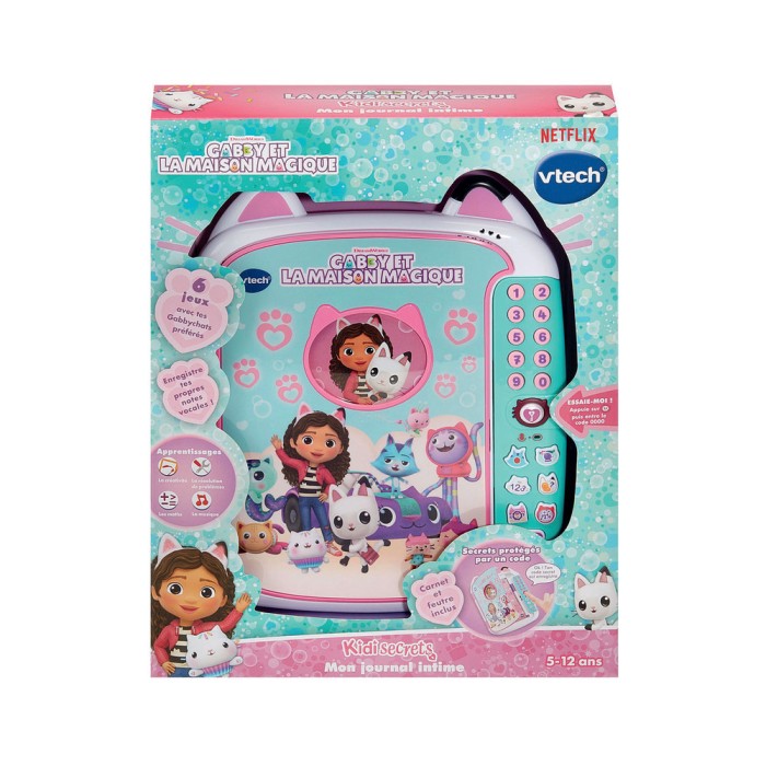 Gabby et la maison magique - KidiSecrets, mon journal intime - 5 - 12 ans Un journal intime sécurisé avec code secret comprenant un carnet A6, un stylo et de nombreuses activités ! 10 touches Chiffres pour créer son propre code secret. 1 touche Enregistrement pour enregistrer jusqu’à 10 mémos vocaux de 40 secondes. 1 micro intégré pour s’enregistrer et s’amuser à modifier sa voix avec l’aide de Marine. 6 activités : Enregistre avec Sacha, Potion vocale de Marine, Découvre les chiffres avec P’tichou, Additionne avec Pandy Pattes, Compte les sons avec Bébé boîte et le Concert de DJ Miaou. Un compartiment caché à l’arrière du journal pour ranger encore plus de secrets. Personnalisable : cadre photo inclus sur la couverture. Arrêt automatique et réglage du volume sonore. Boite Try-me. Fonctionne avec 3 piles LR6 fournies.