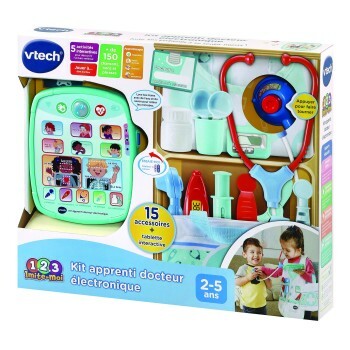 Kit apprenti docteur électronique - 2 - 5 ans Une panoplie de docteur très complète avec tablette interactive pour découvrir le corps humain et soigner ses patients ! • Un grand classique revisité en version électronique. • L’enfant enfile sa blouse et emporte sa sacoche pour se rendre auprès de son patient. Il y trouvera tous les accessoires nécessaires pour le soigner. • À l’aide de sa super tablette électronique, l’enfant apprendra à reconnaître les différents symptômes, les parties du corps humain et les instruments médicaux. • Il pourra également tester ses connaissances médicales avec le quiz de diagnostic interactif. • Une tablette électronique et 15 accessoires. • 5 modes de jeu. • Réglage du volume sonore et arrêt automatique. Boîte try-me. Fonctionne avec 2 piles LR6 fournies.