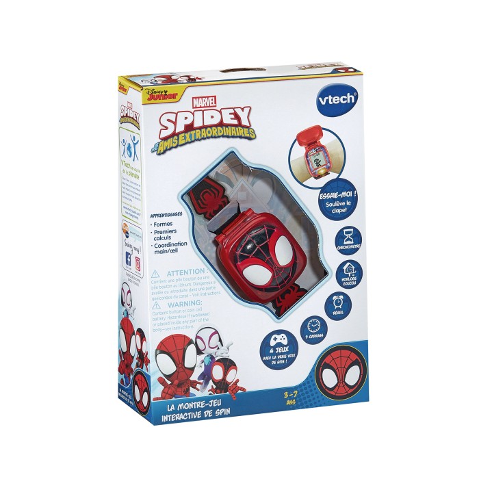 La montre-jeu interactive de Spin - 3 - 7 ans Une montre multifonction et interactive pour partir en mission avec l’équipe Spidey ! L’écran animé affiche les héros de la série : Spin, Ghost-Spider et Spidey à travers : 9 cadrans pour personnaliser sa montre avec ses personnages préférés de la série. 4 jeux pour faire des découvertes avec Spin et toute l’équipe Spidey, s’entraîner au calcul, travailler sa logique, son observation, sa coordination et sa mémoire. De nombreuses interactions au cours des jeux avec les personnages de Spin, Spidey, Ghost-Spider pour les aider à combattre Docteur Octopus, Electro et Zola. Double affichage de l’heure : analogique ou digital. Fonctions alarme/ réveil, coucou (qui retentit toutes les heures, fonction désactivable), chronomètre et sablier. Avec la voix des personnages. Arrêt automatique. Boîte Try-me. Fonctionne avec 1 pile CR2450 fournie.