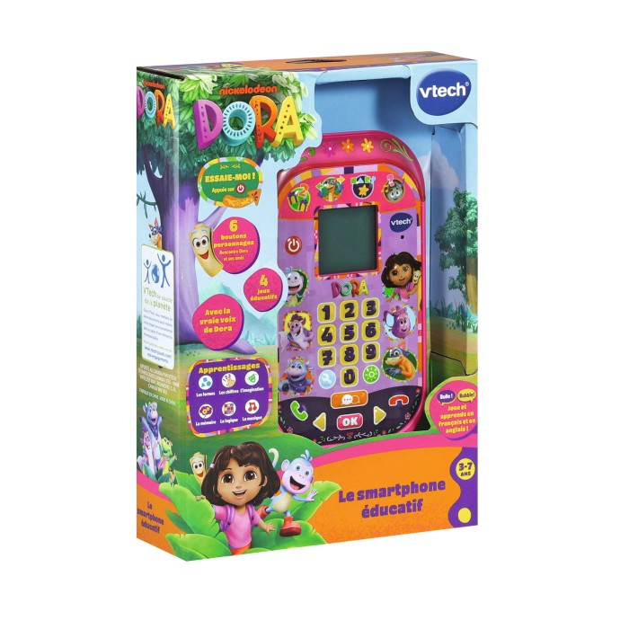 Dora - Le smartphone éducatif (bilingue) - 3 - 7 ans Un téléphone bilingue et lumineux pour apprendre et jouer avec les personnages de la série Dora ! L’écran LCD anime les héros de la série, Dora, Babouche, Sakado et La carte à travers : • 4 jeux pour découvrir les chiffres, les formes, apprendre à compter en français et en anglais, travailler sa logique et sa mémoire. • 6 touches Personnages pour les découvrir et jouer avec eux. • 1 bouton conversation pour jouer à un jeu de questions-réponses. • 1 touche appel pour imiter une conversation avec les personnages de la série Dora. • 1 micro pour jouer et interagir avec les personnages. • 1 bouton Réglages pour ajuster le contraste, activer ou désactiver la musique de fond et choisir sa propre sonnerie. • Écran LCD et contour lumineux. • Avec la voix de Dora. Arrêt automatique. Boite Try-me. Fonctionne avec 2 piles LR6 fournies.