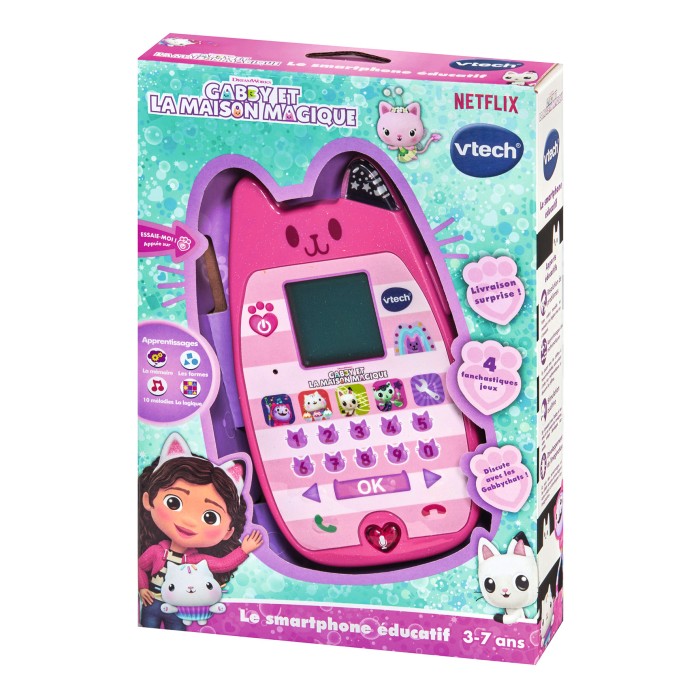 Gabby et la maison magique - Le smartphone éducatif - 3 - 7 ans Un smartphone fan-cha-stique qui s'illumine et ressemble à celui de Gabby ! L'enfant discute avec les personnages de la série et s'amuse avec P'titchou, Dj Miaou, Pandy Pattes et Gabby à travers des jeux for-miaou-dables ! - 4 jeux pour s'amuser en musique, préparer un gâteau avec P'titchou, jouer à la marelle avec Pandy ou préparer une potion avec Marine. - 1 bouton Livraison surprise pour écouter des messages de Gabby et découvrir ses amis. - 1 bouton Discussion avec les Gabbychats pour imiter une conversation avec Gabby et Pandy Pattes. - Un clavier à 10 chiffres pour jouer aux activités. - Un bouton Réglages pour choisir une sonnerie, régler le contraste de l'écran et activer ou désactiver la musique de fond. Arrêt automatique. Boîte Try-me. Fonctionne avec 3 piles LR03 fournies.