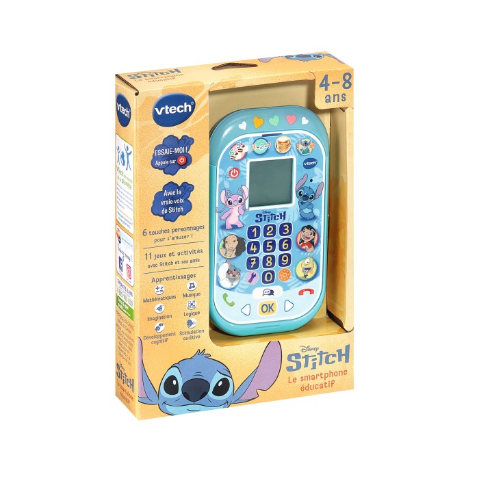 Stitch - Le smartphone éducatif - 4 - 8 ans Un téléphone interactif et lumineux pour apprendre et jouer avec Stitch et ses amis ! L’écran LCD anime Stitch, Lilo et leurs amis à travers : 4 jeux pour découvrir les chiffres, apprendre à compter, travailler sa logique et sa mémoire. 6 touches Personnages pour les découvrir et jouer avec eux. 1 bouton conversation pour jouer à un jeu de questions-réponses. 1 touche appel pour imiter une conversation avec les personnages de la série. 1 micro pour jouer et interagir avec les personnages. 1 clavier avec 10 touches Chiffres. 1 bouton Réglages pour ajuster le contraste, activer ou désactiver la musique de fond et choisir sa propre sonnerie. Écran LCD et contour lumineux. Arrêt automatique. Boite Try-me. Fonctionne avec 2 piles LR6 fournies.