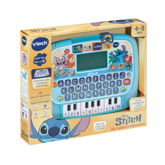 Stitch - Ma tablette éducative - 4 - 8 ans Une première tablette pour de nombreuses activités et découvertes avec Stitch et ses amis ! 10 activités éducatives et 4 modes de jeu pour découvrir les chiffres, le calcul, les lettres, du vocabulaire, la musique, ou encore des quiz. 3 niveaux de difficulté pour accompagner l’enfant dans ses apprentissages et suivre son évolution. L’écran rétroéclairé et les contours de la tablette s’éclairent et changent de couleurs pour animer le jeu (4 variations). Clavier abécédaire et 10 touches de piano pour créer des mélodies, découvrir les chiffres et les personnages. Un mode Quiz et Mémoire pour tester ses connaissances avec les personnages de la série. Écran LCD et contour lumineux. Arrêt automatique et réglage du volume sonore. Boîte Try-me. Fonctionne avec 2 piles LR6 fournies.
