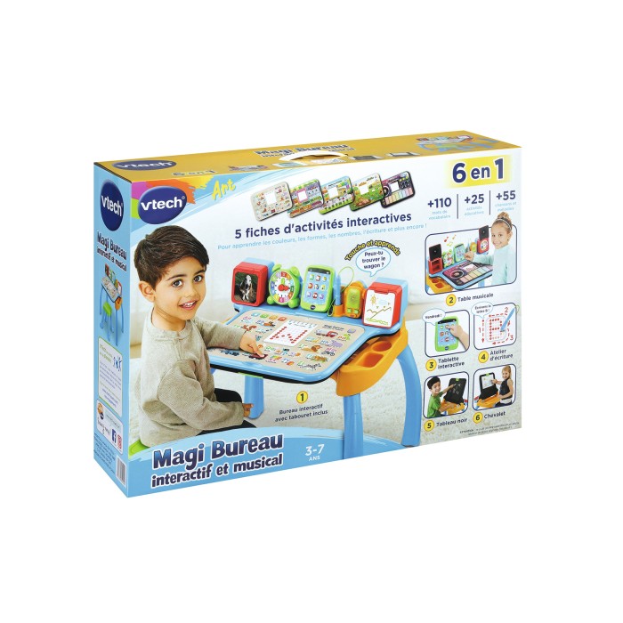 MagiBureau interactif et musical 6 en 1 - 3 - 7 ans Un nouveau bureau 100% interactif pour faire le plein d’apprentissages ! 5 fiches éducatives (2 recto verso et 1 fixe) pour découvrir l’alphabet, les chiffres, les animaux, les formes, les couleurs, les émotions, les fruits et légumes et la musique ! Un stylet interactif pour dessiner et écrire sur l’écran interactif et jouer sur les différentes fiches d’activités incluses. Nouveau : le bureau interactif se transforme facilement en table musicale grâce à la fiche Musique et à l’enceinte intégrée. L’enfant découvre les notes de musique et devient un vrai petit maestro. Il peut découvrir 3 styles musicaux : Pop, Techno et Dance et 5 instruments. Les touches de piano lui permettent de créer ses propres compositions avec les différents instruments et les effets sonores amusants. Il peut modifier le rythme et moduler la hauteur des mélodies avec les touches de réglages. Chevalet et tableau noir au recto du plateau interactif pour les artistes en herbe. Tablette interactive pour faire semblant de recevoir des messages, découvrir les jours de la semaine et la météo, jouer à répéter des phrases difficiles à prononcer, prétendre prendre des photos et écouter de la musique (36 pistes incluses). Rangements, cadre photo et horloge mécanique intégrés. Tabouret inclus. Existe en deux coloris : bleu et rose. Arrêt automatique. Réglage du volume sonore. Boite fermée. Fonctionne avec 4 piles LR6 fournies.