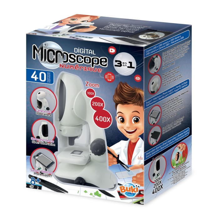 Un microscope 3 en 1 pour découvrir le monde du minuscule. Mode Webcam USB : pour réaliser des observations sur Mac ou PC. Mode Smartphone : utilise un téléphone ou une tablette pour observer. Mode Yeux : l’enfant peut l’utiliser comme un microscope classique. Zoom jusqu’à X400. Double éclairage LED. Divers accessoires inclus : scalpel, pince, 15 échantillons... Notice illustrée en couleurs. Nécessite 3 piles LR06-AA non incluses. Dès 8 ans.