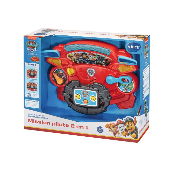 Pat Patrouille - Mission Pilote 2 en 1 - 3 - 7 ans Prêt à partir en mission avec Marcus et Ryder ? C’est parti à bord de ce super simulateur de conduite ! Grâce à son volant transformable, ce simulateur de conduite très complet aux couleurs de la Pat’ Patrouille possède deux modes de pilotage différents : Volant de camion de pompier avec Marcus et Volant de quad avec Ryder. Magique, la console reconnaît la transformation du volant et déclenche du contenu adapté avec les vraies voix de Marcus et Ryder ! 3 modes de jeu sont inclus pour chaque configuration : - Mode Musique : amuse-toi en écoutant différentes musiques et effets sonores de véhicules ! - Mode Apprentissages : découvre différentes fonctionnalités et apprend à piloter le quad et le camion de pompiers ! - Mode Missions : suis les instructions de Ryder pour accomplir différentes missions ! 6 boutons personnages permettent d'en apprendre plus sur les différents membres de la Pat'Patrouille. Différents éléments réalistes : levier de vitesses, tableau de bord avec sirène, klaxon et fonction appel, ainsi qu'un volant pour diriger son simulateur de conduite. Un panneau lumineux s’illumine en rythme avec les phrases et les sons et montre le niveau de vitesse. Arrêt automatique et réglage du volume sonore. Boîte ouverte. Fonctionne avec 2 piles LR6 fournies.