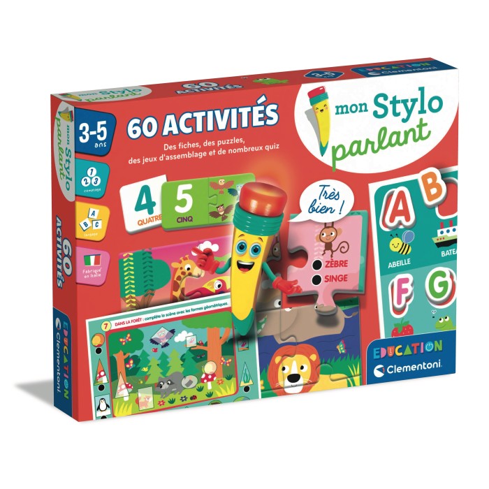 Un coffret de jeux avec 60 activités éducatives qui abordent tous les sujets clés de l’apprentissage dans l’enseignement scolaire : couleurs, formes, alphabet, nombres à l'aide du stylo parlant.