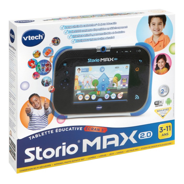 STORIO MAX 5'' 2.0 bleue - 3 - 11 ans Maintenant en version 2.0 avec un design plus moderne ! Storio Max 2.0 possède une nouvelle interface avec des fonds d'écran en 3D animés qui évoluent avec l'enfant. Plus l'enfant personnalise son fond d'écran, plus celui-ci évolue. Et toujours des performances MAX : - Ecran couleur tactile capacitif HD multi-touch de 5'' réversible et sensible aux mouvements - Processeur rapide avec système Android 4.2 - Batterie lithium rechargeable intégrée (rechargeable par USB - câble USB-C non inclus). - Mémoire interne de 32 Go extensible jusqu'à 64 Go via une carte micro SD (non incluse) - Pavé directionnel pour une expérience de jeu encore plus intense Au total, 20 applications/jeux intégrés (+2 à télécharger gratuitement), dont : -KidiCom Chat : pour garder le contact avec ses proches, en envoyant des messages (photos, vidéos, audio, dessins, textes) sur leur tablette/smartphone - Lecteur de livres numériques - Console de jeux éducatifs avec capteur de mouvement : 3 jeux inclus - Studio de dessins et coloriages - Appareil photo rotatif (2 MP), album photo, studio photo - Caméscope, lecteur vidéo pour regarder des dessins animés - Lecteur de musique (prise casque ou haut parleur) - Outils pratiques : horloge, chronomètre, calendrier, bloc-notes Contrôles parentaux : accès WiFi, gestion des sites Internet autorisés, temps de jeu, profils utilisateurs… Evolutive via les cartouches de jeux Storio et plus de 2000 applications Android et autres contenus développés par VTech et par nos partenaires à télécharger sur l'Explor@ Park. Accès à une boutique d'applications Android. Ports USB, casque. Fonctionne sur batterie lithium rechargeable (intégrée) (câble USB-C non inclus). Boîte fenêtre avec rabat. DAS pour le tronc : 0.316 DAS pour les membres : 0.218