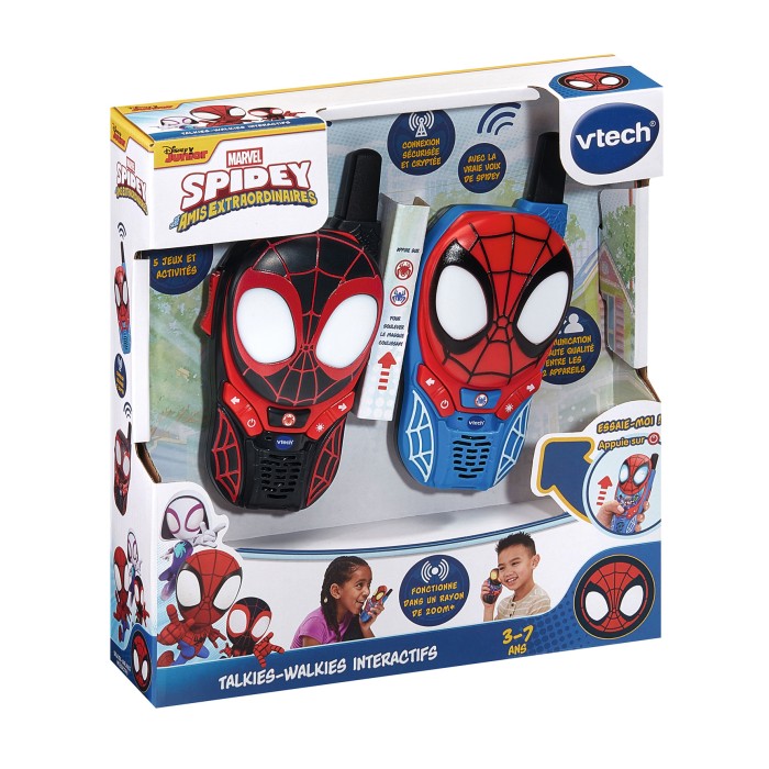 Spidey - Talkies-Walkies interactifs - 3 - 7 ans Des talkies-walkies interactifs pour découvrir, échanger et apprendre en aidant les membres de l’équipe Spidey ! Communication à distance sécurisée avec une portée de 200 mètres entre les 2 appareils. 5 touches Personnages pour bouger et se relaxer avec Spidey, aider Spin à trouver la bonne direction, partir en mission de sauvetage avec Ghost-Spider, apprendre à compter avec Hulk et aider Miss Marvel à combattre le Bouffon vert. 1 bouton Lumière pour illuminer les yeux des personnages et choisir la couleur 1 bouton Araignée pour actionner le clapet coulissant. Avec la voix officielle de Spidey. Arrêt automatique et réglage du volume sonore. Boite Try-me. Chaque talkie-walkie fonctionne avec 3 piles LR03 fournies.