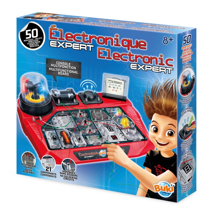 Assemble les composants sur la console et réalise plus de 50 montages électroniques : alarme, effets sonores, afficheur numérique... Composants sans soudure donc sans danger : LEDs, interrupteurs photosensibles, magnétiques et tactiles, transistors, résistances, haut-parleur et gyrophare… Notice illustrée en couleurs. Dès 8 ans. Nécessite 2 piles LR06 non incluses.
