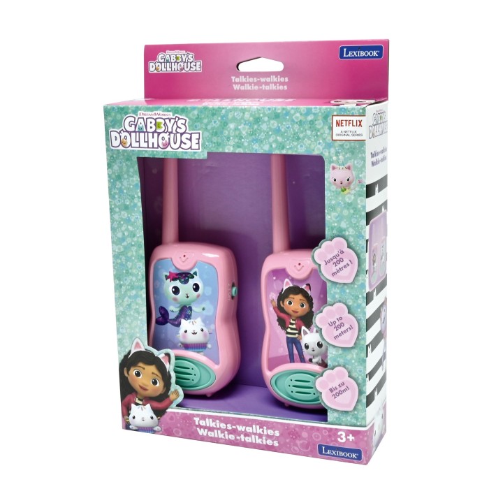 COMMUNIQUE AVEC TES AMIS AVEC UNE MAGNIFIQUE PAIRE DE TALKIES-WALKIES GABBY ET LA MAISON MAGIQUE ! UN DESIGN ERGONOMIQUE POUR UNE PRISE EN MAIN FACILE ! UNE PORTÉE DE TRANSMISSION JUSQU’À 200M EN EXTÉRIEUR (PEUT VARIER EN FONCTION DU RELIEF ET CONDITIONS CLIMATIQUES). CLIP CEINTURE 2 CANAUX DE COMMUNICATION