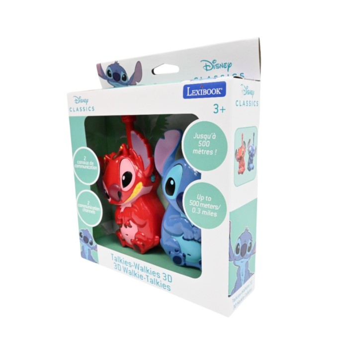 UNE PAIRE DE TALKIES-WALKIES STITCH ET LEROY POUR COMMUNIQUER AVEC STYLE ENTRE FANS D'AVENTURE ! • UNE PORTÉE DE TRANSMISSION JUSQU'À 500 MÈTRES EN EXTÉRIEUR (EN FONCTION DU RELIEF ET DES CONDITIONS CLIMATIQUES). • 2 CANAUX DE COMMUNICATION POUR DISCUTER AVEC PLUSIEURS PERSONNES. • CLIP CEINTURE. • SUPER DESIGN 3D AVEC STITCH ET LEROY.