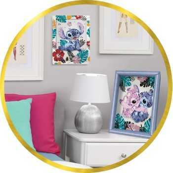 Réalise des créations étincelantes avec Collection Sequins ! Dans ce kit, tu trouveras l’illustration de Stitch Aloha Hawaii dans son cadre, avec une plaque de polystyrène qui sert de base pour fixer les sequins à l’aide de petites épingles. Un compartiment à sequins t’aidera à ranger tous tes sequins sans les mélanger ! La place de chaque sequin est imprimée sur l’image, afin que tu puisses facilement identifier et positionner les sequins correspondants. Accroche ou pose ton cadre pour décorer ta chambre !