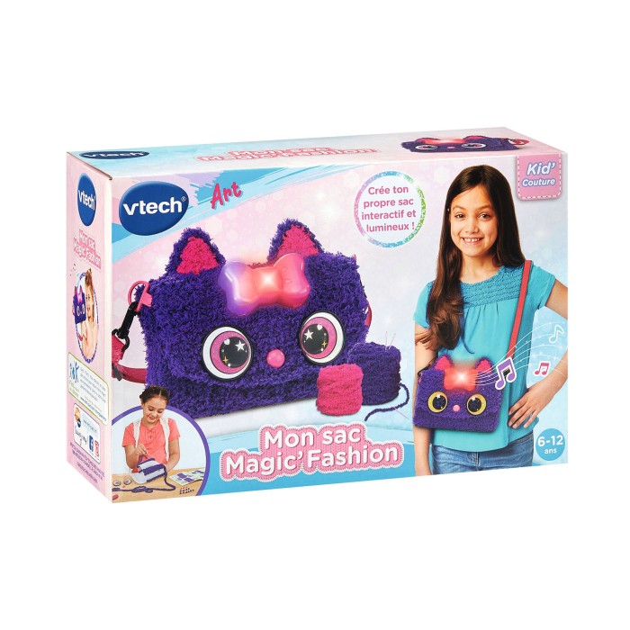 Kid'Couture - Mon sac Magic'Fashion (chat) - 6 - 12 ans Un sac 100% fait main, à coudre et à assembler pour porter fièrement sa création et interagir avec elle ! Grâce aux instructions du guide de création, l’enfant crée pas à pas un adorable sac en forme de chat qui se transforme aussi en compagnon interactif. Tous les accessoires pour créer son sac sont inclus dans la boîte : canevas en plastique, 2 bobines de fils, 3 aiguilles en plastique, 1 bandoulière ajustable, des accessoires à clipser (nez et yeux), noeud lumineux et compartiment à piles. Magique ! Le noeud du chat réagit quand on le touche et déclenche des sons amusants et + de 10 effets lumineux magiques. 3 modes de jeu permettent d’interagir avec le sac une fois assemblé : - Mode Lumières : pour découvrir 18 variations lumineuses en touchant le noeud magique. - Mode Musical : pour écouter 11 mélodies et voir le noeud s’illuminer en rythme - Mode Fashion Motion : pour déclencher des effets sonores et lumineux en secouant le sac. Plus qu’un simple sac, Mon sac Magic’fashion est un accessoire de mode unique et fait main pour développer la créativité de l’enfant et l’initier à la couture et aux loisirs créatifs ! Arrêt automatique. Boite fermée. Fonctionne avec 2 piles LR6 non fournies.