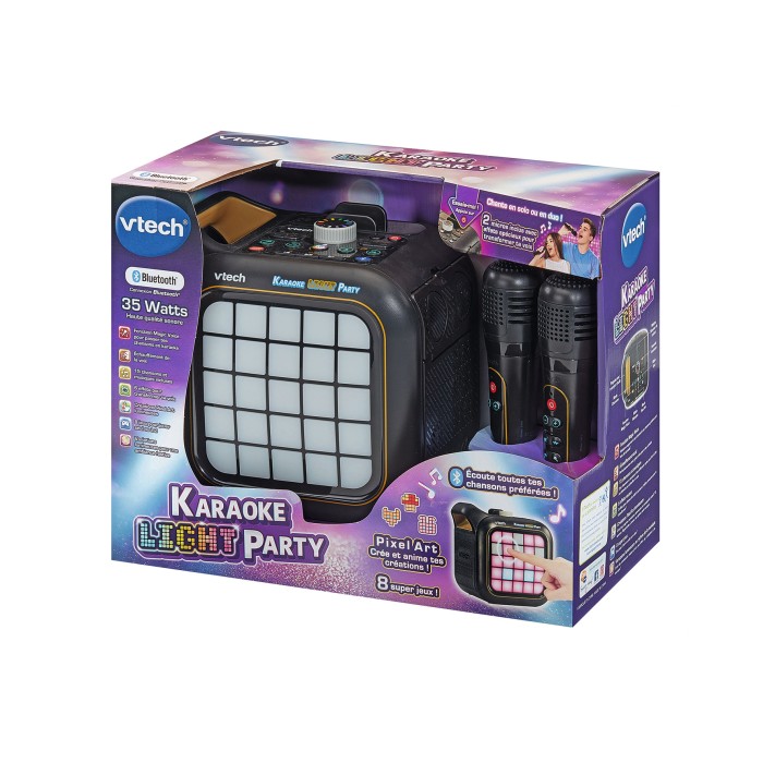 Karaoké Light Party Une super enceinte lumineuse et puissante pour des soirées karaoké au top ! 2 micros sans fil avec 4 boutons effets sonores pour chanter en duo et ajouter un vibrato, des chœurs, ou modifier sa voix. 5 modes et 13 activités différents pour échauffer sa voix et apprendre à chanter, écouter des mélodies, faire du pixel art, jouer seul ou en duo. 25 boutons Pixels colorés pour s’amuser, créer et personnaliser son propre Pixel art qui s’anime au rythme des mélodies. 8 jeux avec les lumiètes inclus . Fonction Magic Voice pour effacer les paroles de ses chansons et prendre la place du chanteur. 10 mélodies incluses et 5 chansons incluses pour échauffer sa voix et apprendre à chanter Connexion Bluetooth et prise Jack incluse pour connecter un casque audio. Puissance 35W Arrêt automatique. Réglage du volume sonore. Boite Try-me. Fonctionne avec 6 piles LR6 fournies pour l'enceinte et 4 piles LR6 pour les micros ou sur adaptateur secteur.