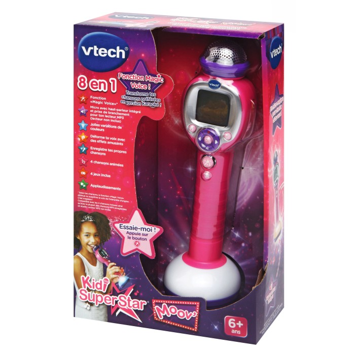 Kidi SuperStar Moov' - 6 ans et + Ce super micro permet de chanter en karaoké sur ses chansons préférées. Il suffit de brancher son lecteur MP3 grâce au câble inclus et de chanter sur ses mélodies favorites. Grâce à sa technologie innovante, Kidi SuperStar joue la mélodie du titre sans les paroles pour chanter librement. Fonctionne avec la très grande majorité des chansons (sauf enregistrements en live). 4 chansons « Magic Voice » animées pré-incluses. Avec un écran interactif qui affiche des animations et le style de musique. Plein d'effets de lumières qui varient selon l'intensité de la chanson. Possibilité d'enregistrer sa voix (jusqu'à 4 min). Des jeux avec reconnaissance vocale. Déformation de la voix grâce aux effets rigolos. Applaudissements, échos et autres effets concerts. Réglage du volume sonore et arrêt automatique. Boîte Try-me. Fonctionne avec 2 piles LR6 fournies.
