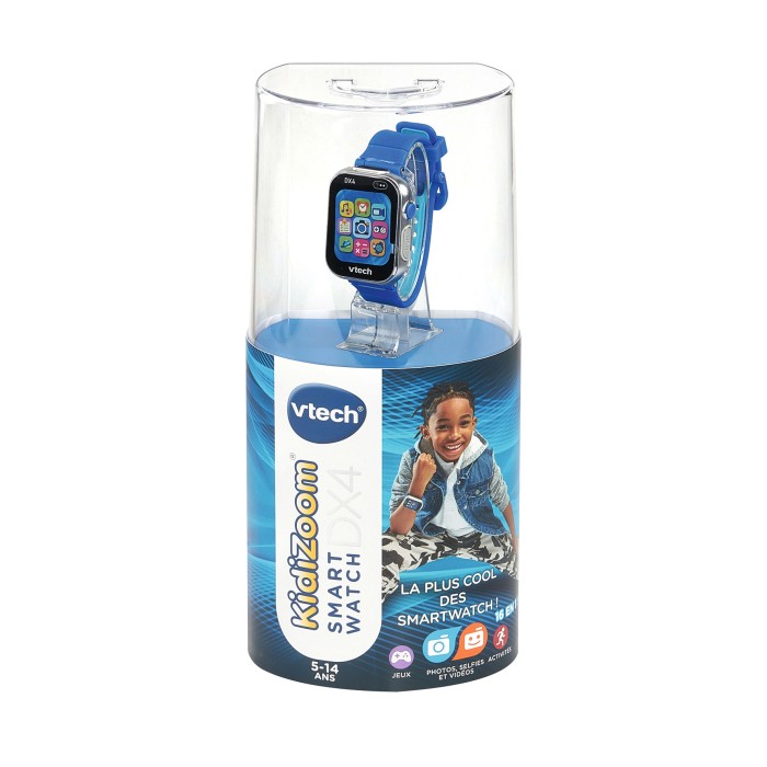 KidiZoom Smartwatch DX4 bleue - 5 - 14 ans Une montre high-tech 16 en 1 avec double objectif pour prendre des photos et des vidéos en selfie. Nouveau look avec cadran premium métallique et bracelet bicolore. Grâce au capteur intégré, la montre suit l’enfant dans tous ses mouvements. Lorsque l'enfant secoue sa montre, il peut voir l’heure s'afficher et l’entendre. L’écran permet de déclencher de nombreuses fonctions : - Un double objectif avec caméra frontale pour prendre des photos et enregistrer des vidéos en selfie double affichage de l’heure (numérique ou analogique), appareil photo et caméra vidéo, écran personnalisable avec effets 3D, trucages, cadres et ajout de filtres de couleur. - 3 défis sport pour s’amuser en sautant, en dansant ou en courant. - 8 jeux et activités dont un jeu avec détection de couleurs, fonction réveil/alarme, enregistrement et déformation de la voix, détecteur de visage pour des effets rigolos, chronomètre, sablier, calendrier et calculatrice. - Nouvelles fonctions lampe torche et lecteur de musique - Connexion à l’Explor@ Park pour télécharger des applis, des jeux et des trucages photos supplémentaires. Existe en quatre coloris : bleu, noir, rose et violet. Arrêt automatique. Boîte Cristal. Batterie rechargeable.