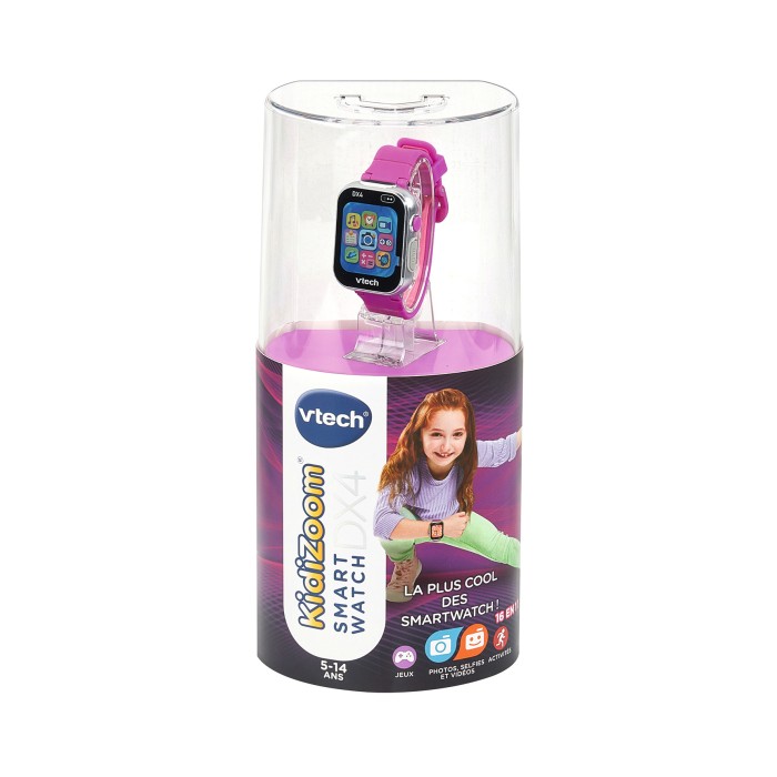 KidiZoom Smartwatch DX4 framboise - 5 - 14 ans Une montre high-tech 16 en 1 avec double objectif pour prendre des photos et des vidéos en selfie. Nouveau look avec cadran premium métallique et bracelet bicolore. Grâce au capteur intégré, la montre suit l’enfant dans tous ses mouvements. Lorsque l'enfant secoue sa montre, il peut voir l’heure s'afficher et l’entendre. L’écran permet de déclencher de nombreuses fonctions : - Un double objectif avec caméra frontale pour prendre des photos et enregistrer des vidéos en selfie double affichage de l’heure (numérique ou analogique), appareil photo et caméra vidéo, écran personnalisable avec effets 3D, trucages, cadres et ajout de filtres de couleur. - 3 défis sport pour s’amuser en sautant, en dansant ou en courant. - 8 jeux et activités dont un jeu avec détection de couleurs, fonction réveil/alarme, enregistrement et déformation de la voix, détecteur de visage pour des effets rigolos, chronomètre, sablier, calendrier et calculatrice. - Nouvelles fonctions lampe torche et lecteur de musique - Connexion à l’Explor@ Park pour télécharger des applis, des jeux et des trucages photos supplémentaires. Existe en quatre coloris : bleu, noir, rose et violet. Arrêt automatique. Boîte Cristal. Batterie rechargeable.
