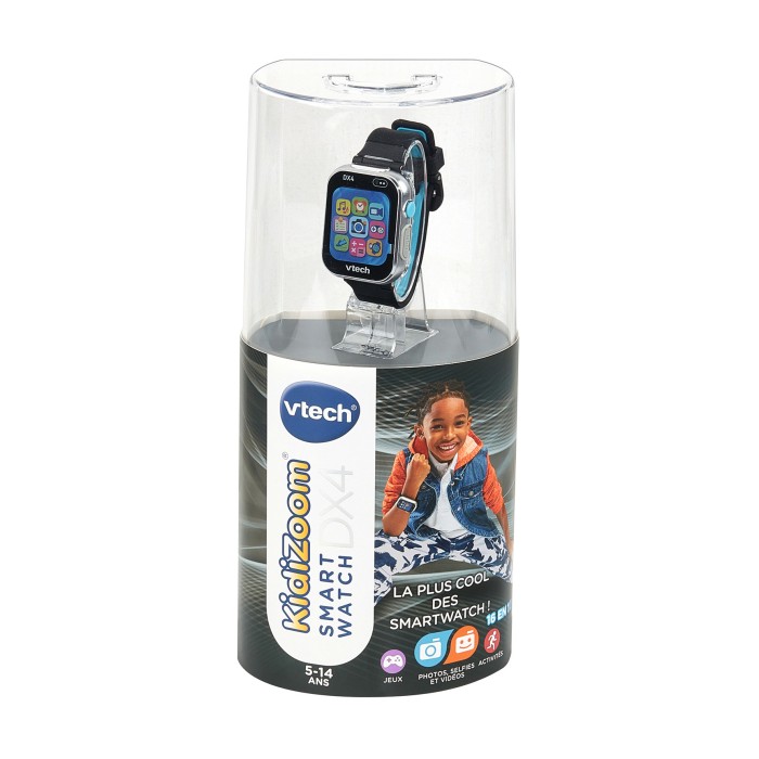 KidiZoom Smartwatch DX4 noire - 5 - 14 ans Une montre high-tech 16 en 1 avec double objectif pour prendre des photos et des vidéos en selfie. Nouveau look avec cadran premium métallique et bracelet bicolore. Grâce au capteur intégré, la montre suit l’enfant dans tous ses mouvements. Lorsque l'enfant secoue sa montre, il peut voir l’heure s'afficher et l’entendre. L’écran permet de déclencher de nombreuses fonctions : - Un double objectif avec caméra frontale pour prendre des photos et enregistrer des vidéos en selfie double affichage de l’heure (numérique ou analogique), appareil photo et caméra vidéo, écran personnalisable avec effets 3D, trucages, cadres et ajout de filtres de couleur. - 3 défis sport pour s’amuser en sautant, en dansant ou en courant. - 8 jeux et activités dont un jeu avec détection de couleurs, fonction réveil/alarme, enregistrement et déformation de la voix, détecteur de visage pour des effets rigolos, chronomètre, sablier, calendrier et calculatrice. - Nouvelles fonctions lampe torche et lecteur de musique - Connexion à l’Explor@ Park pour télécharger des applis, des jeux et des trucages photos supplémentaires. Existe en quatre coloris : bleu, noir, rose et violet. Arrêt automatique. Boîte Cristal Batterie rechargeable.